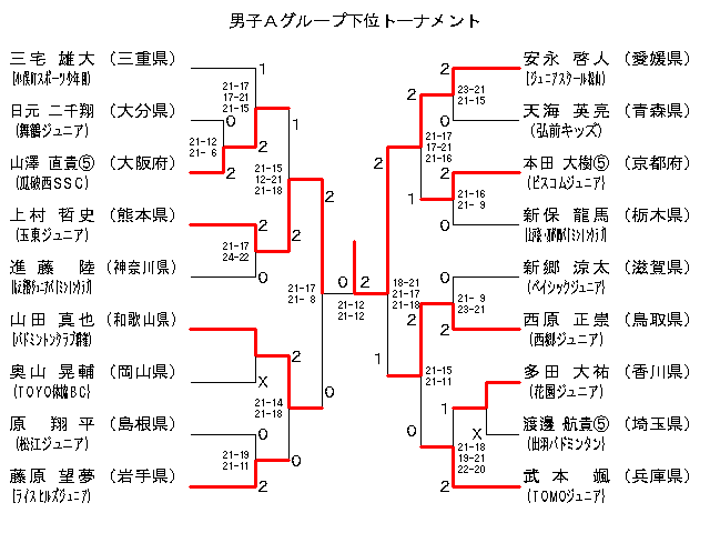 | 安永 啓人 (ジュニアスクール松山) | × 10-21 21-18 9-21 | × 17-21 23-21 20-22 | 3 |