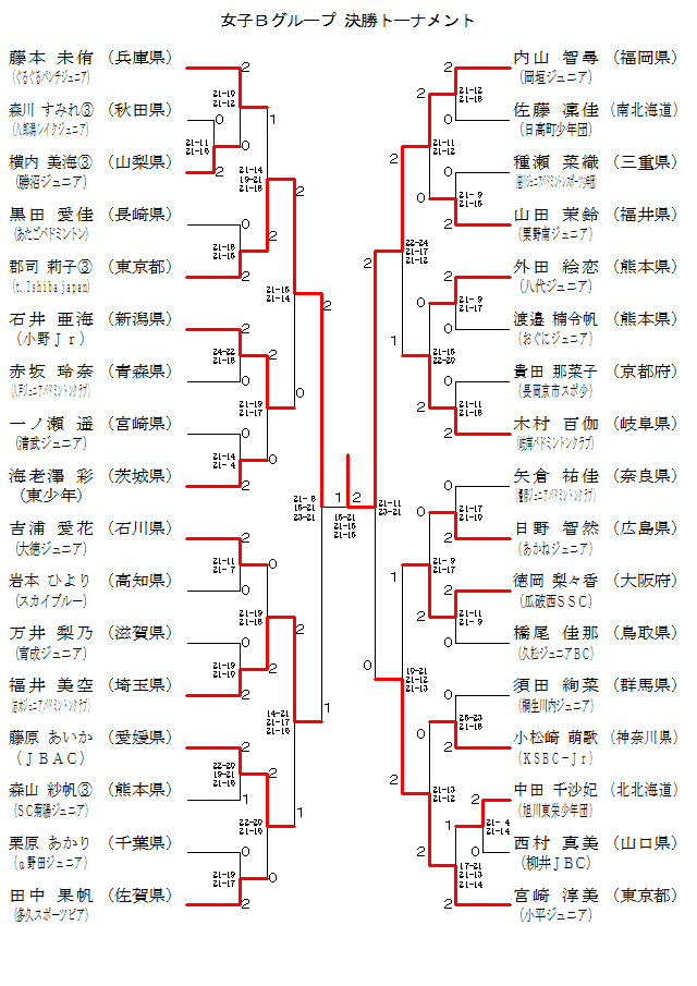 | 栗原 あかり (α野田ジュニア) | × 16-21 21-14 14-21 | ○ 21-16 21- 6 | 2 |
