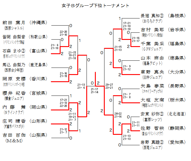 | 皆岡 由梨音 (バドミントンクラブ群雀) | × 11-21 22-20 17-21 | × 21-19 3-21 6-21 | × 16-21 15-21 | 4 |