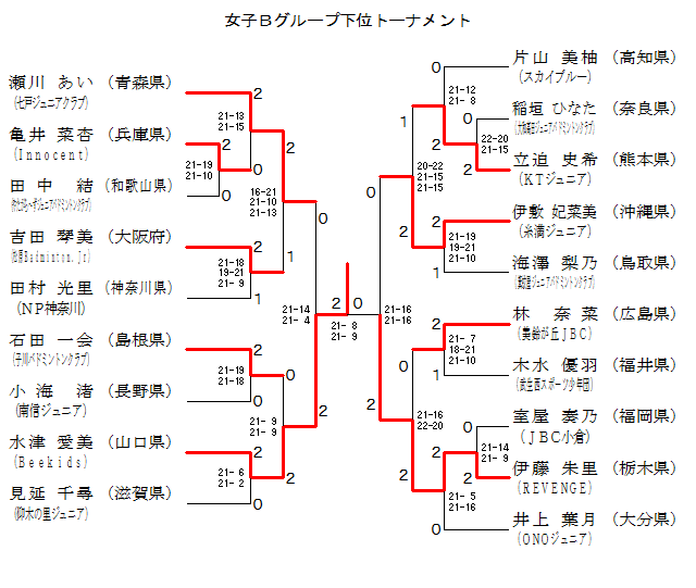 | 稲垣 ひなた (大和高田ジュニアバドミントンクラブ) | × 14-21 7-21 | × 15-21 18-21 | 3 | |